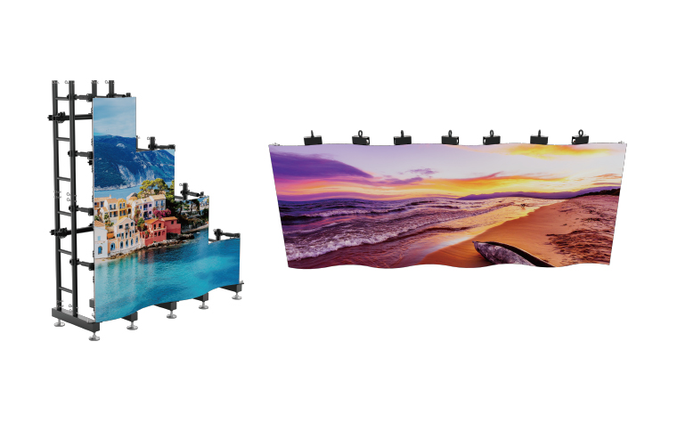 ⑥ 吊裝堆裝皆可,曲線依然:FL系列設(shè)計(jì)了小巧靈活的吊裝塊配件,以及前端帶有獨(dú)立連接片的專用配套支撐架配件,完美適配各種造型的弧形屏體安裝需求。